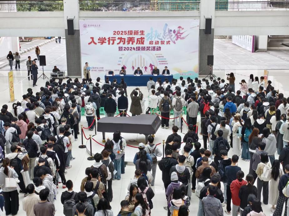 11月5日中午,2025级新生入学行为养成挑战赛启动仪式暨2024级颁奖活动在教学主楼大厅举行。党委学生工作部(党委武装部、学生处)、图书馆(档案馆、校史馆)、体育部相关负责人,2024级全体获奖学生及2025级新生代表参加仪式。活动由党委学生工作部副部长罗庆洪主持。